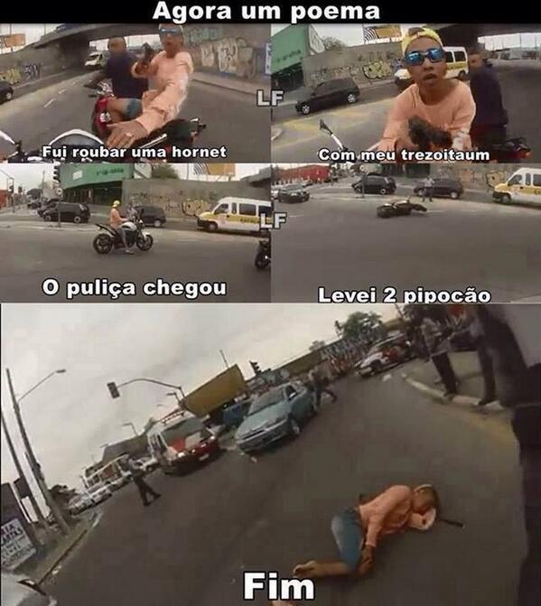 Curioso notar como a audiência da internet lidou com a situação. Houve uma grande mescla de indignação com humor. A maioria dos comentários nas redes sociais satiriza o bandido, que continua internado em São Paulo. Difícil imaginar ou puxar rapidamente pela memória um caso parecido com esse, onde um crime vira meme.